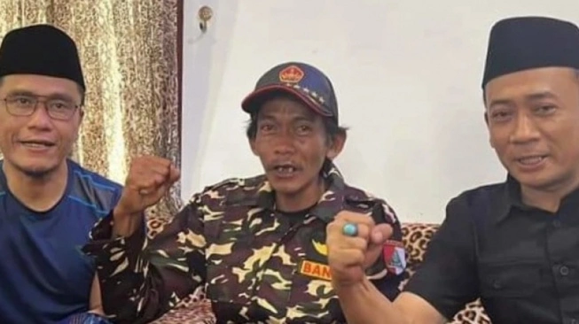 | Pedagang es teh Sunhaji yang mengenakan seragam Banser diapit Gus Miftah dan Ketua Wilayah GP Ansor DIY Abdul Muiz. Sunhaji baru saja didapuk sebagai anggota kehormatan Banser DIY. [Dok. NU Online] |